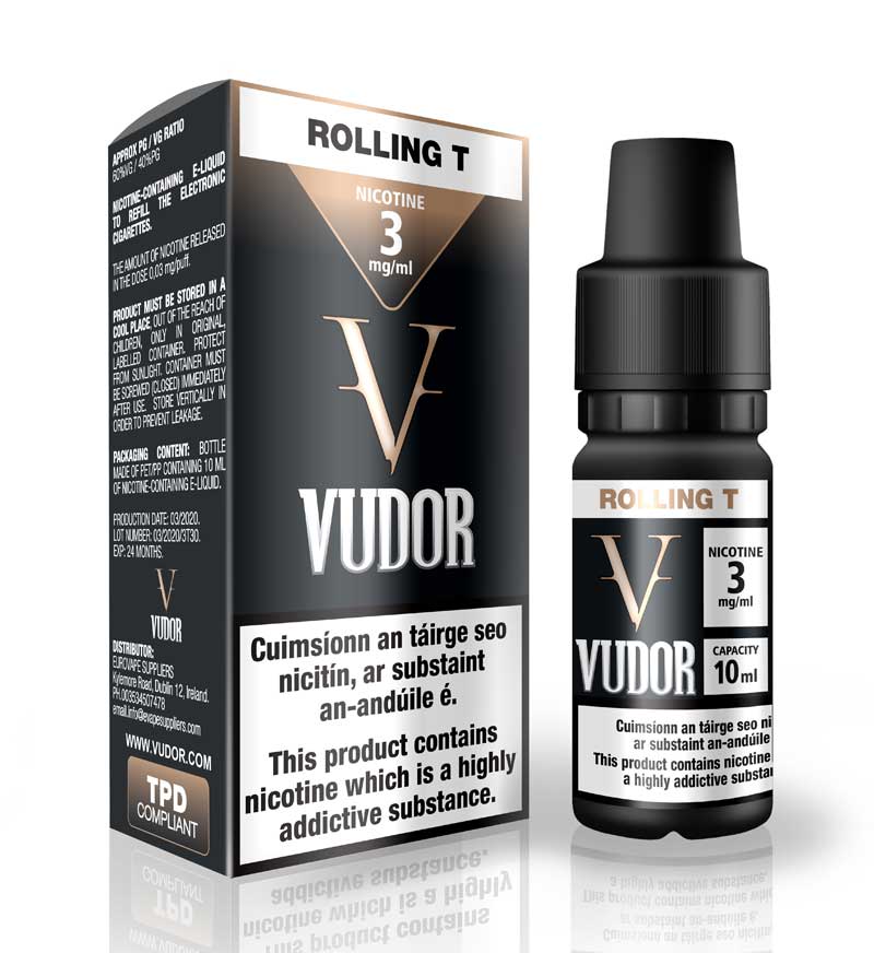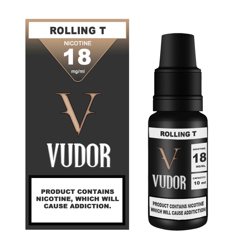 ROLLING T flavoured e liquid is a smooth full flavoured tobacco, made from the finest grade Nicotine in the world is now available in your area! The quality of vudor rolling t e liquid need only speak for themselves; they are premium quality all the way!